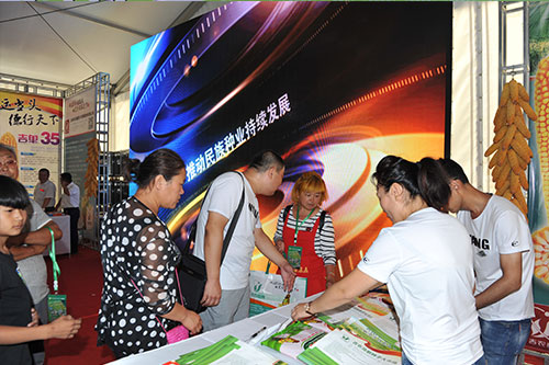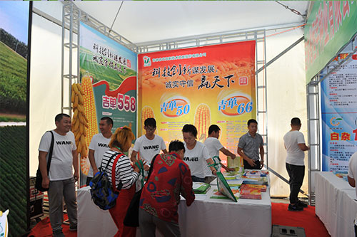 玉米產業博覽會有七個展區,有書畫筆會展區、玉米全株產業鏈圖片展區、種植業結構調整展區、農村電商展區、玉米全株產業鏈產品展示交易區、玉米種子展區、畜牧業展區。我公司在玉米全株產業鏈圖片展區重點展示了吉單27、吉單522、吉單35、吉單519、吉單505等獲得過國家或省里重大科技獎勵的品種。玉米種子展區中有主銷玉米品種的資料宣傳,重點展示了公司的吉單558、吉單50、吉單66、吉單47、吉單35等新品種;LED大屏幕宣傳公司的整體形象;在東側的主通道上有新品種種植區,重點展示了公司即將推出的新品種,吉單1402、吉單84、吉單96、吉單510等。